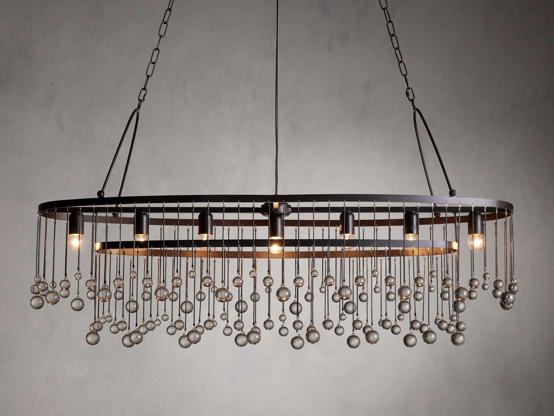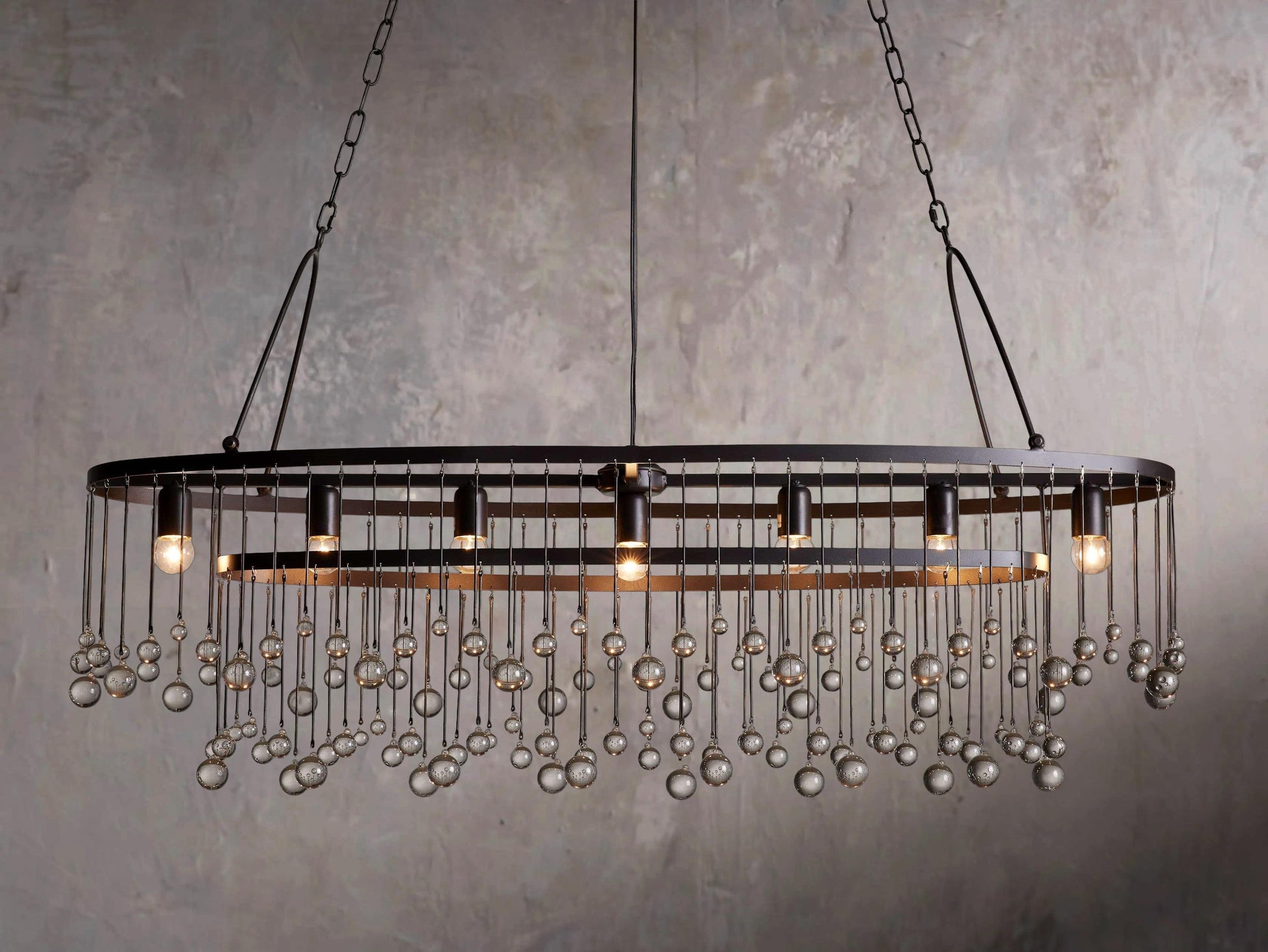 Equally at ease in an ancient French castle or a downtown New Orleans loft, the Aubrey Chandelier delivers dramatic ambiance in any environment. Crystal drops suspended in varying lengths from an iron cage create the impression of movement as they catch the light, refracting radiant beams throughout your room.