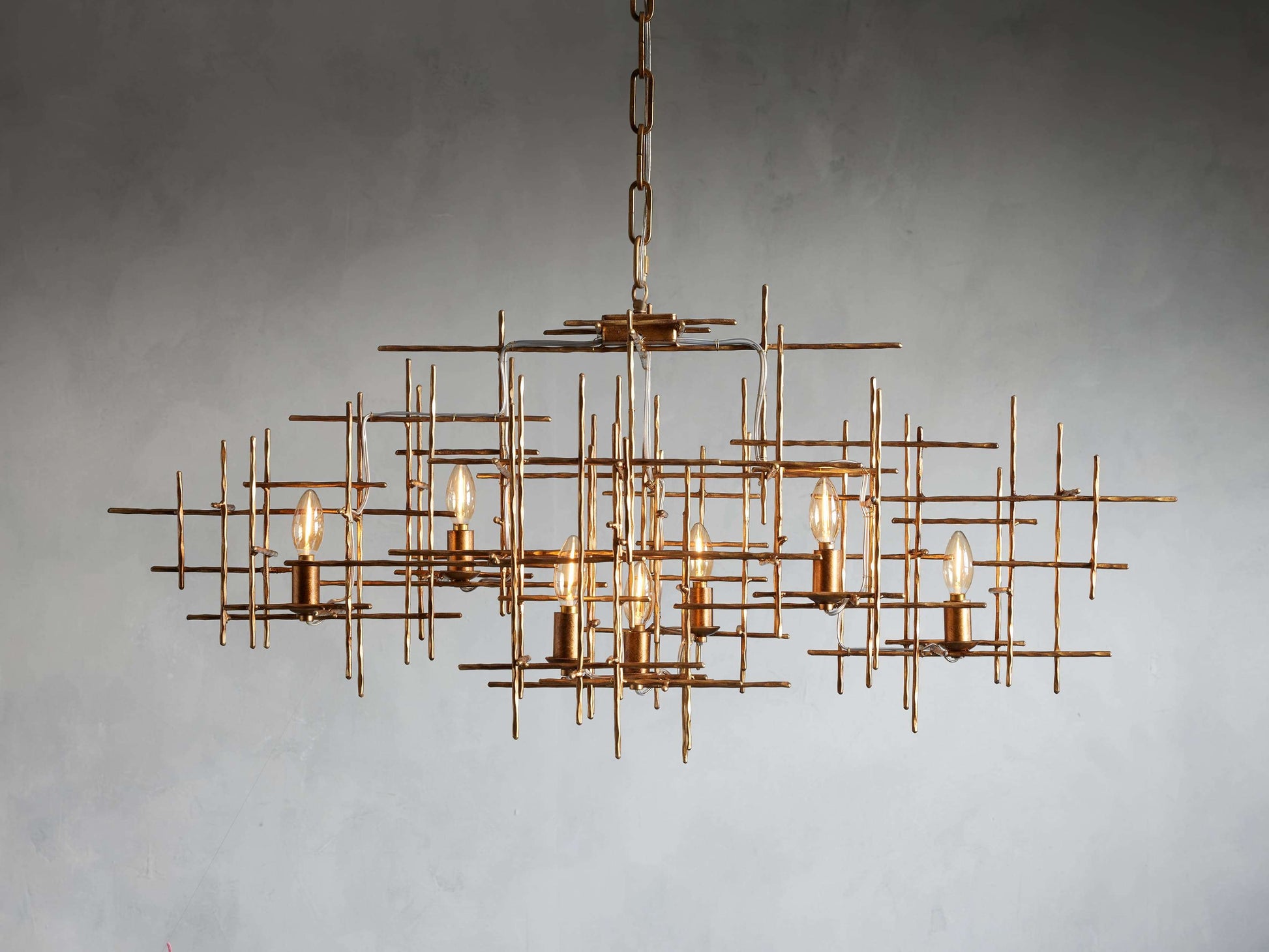 A dramatic artistic chandelier featuring hand-hammered iron linear structures and a dark antique gold varnish finish. Its shimmering midcentury-inspired glamour is ideal for boutique restaurants, hotel homestays, and expressive interior spaces.