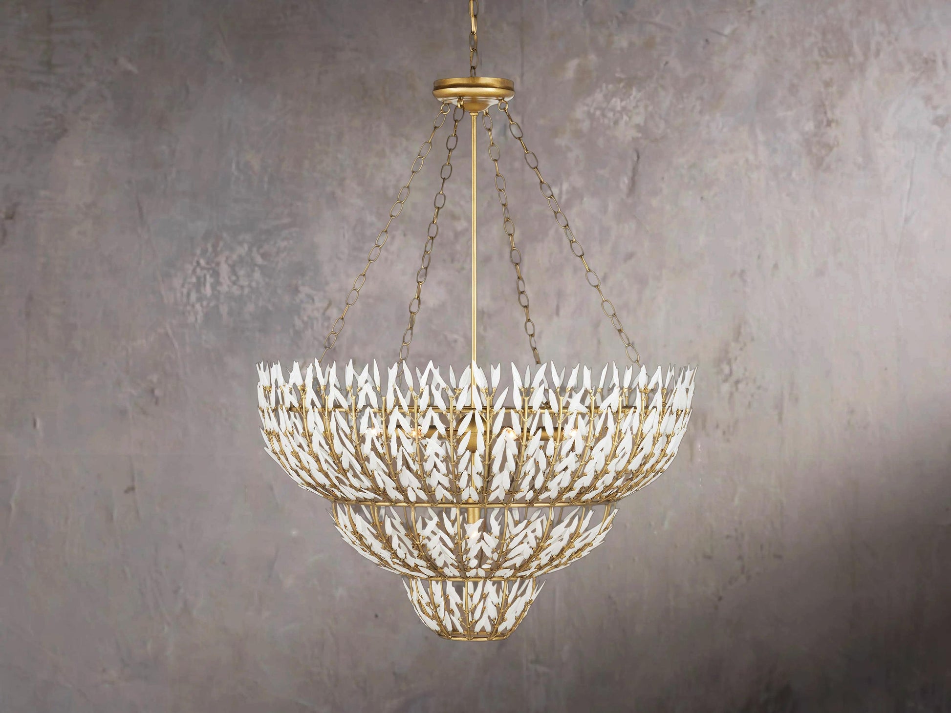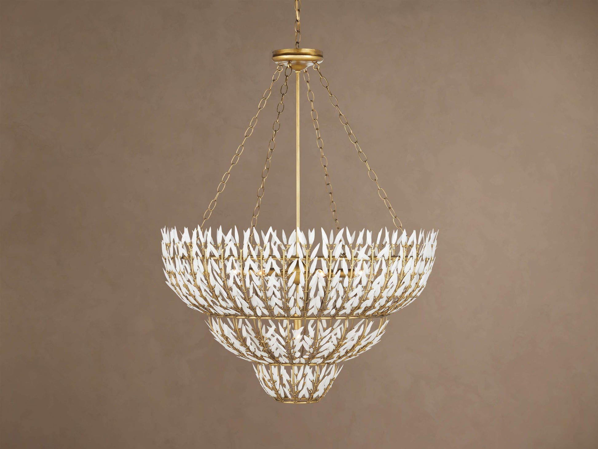 Meta Description A vintage-inspired artistic chandelier featuring three tiers of white glass leaves spread across brass arcs, creating motion and subtle texture in a refined sculptural light. Ideal for boutique dining rooms, hotel homestays, and expressive modern interiors.
