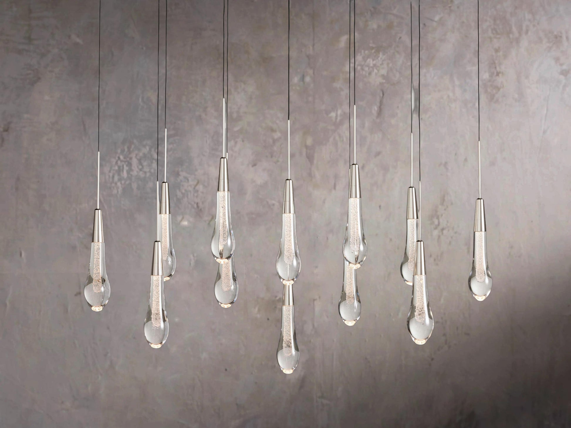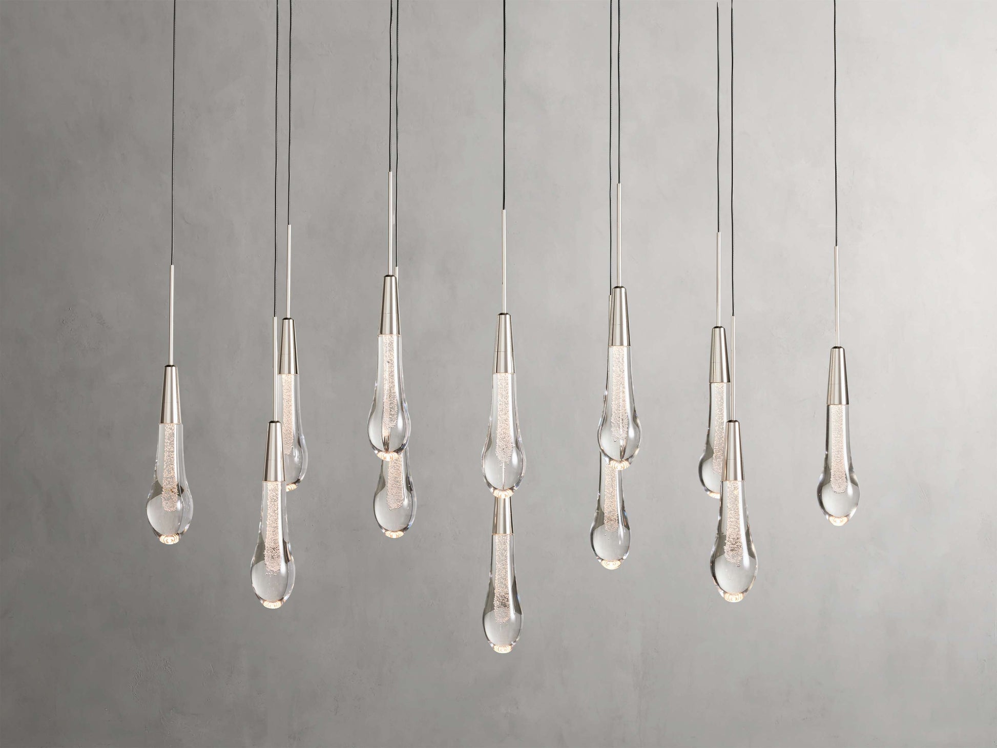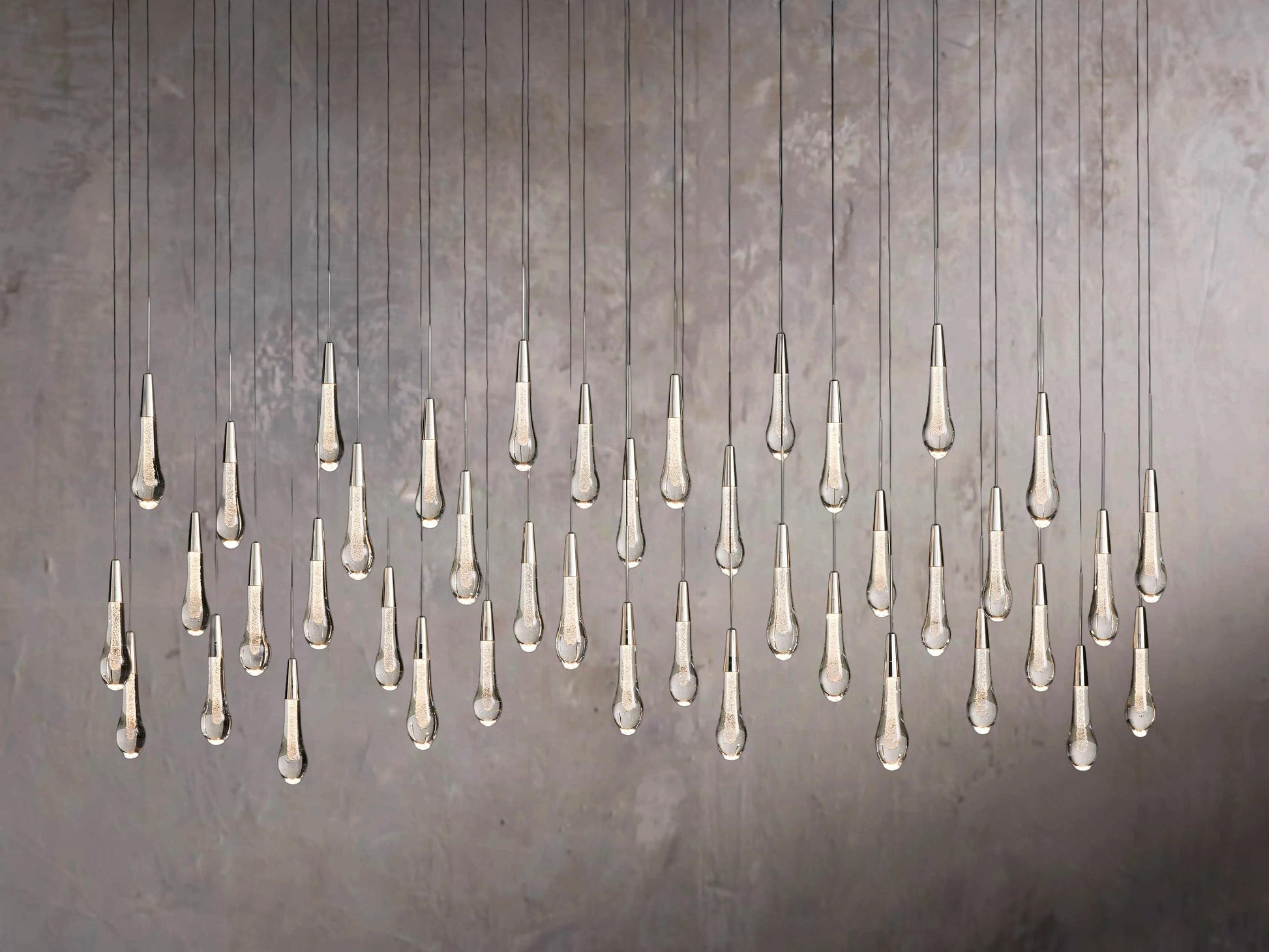 Showcasing adjustable black PVC cords cascading into integrated LED lights meticulously handcrafted from seeded glass, this chandelier emulates the appearance of a fallen raindrop.